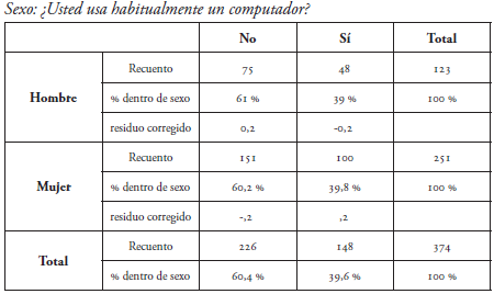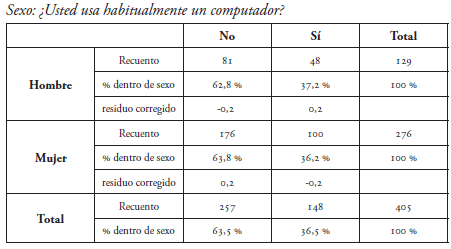 Como se puede observar en la tabla 1, no existe una relación estadísticamente significativa entre sexo y uso del computador (p>0,87), elemento de mucho interés, porque se hubiera esperado que existiera una diferenciación por sexo, como regularmente sucede con la población general. Más allá de las personas jóvenes que habitualmente utilizan el computador, se podría esperar que los hombres lo utilizaran mayormente. Sin embargo, tal y como la Subtel (2017) afirma, no existen diferencias significativas.