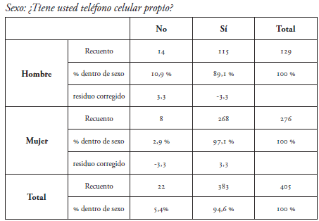 En la relación que se establece entre las variables sexo y teléfono celular propio, podemos encontrar en la tabla 2 que existe una relación estadísticamente significativa (χ2 (1, N = 405) = 10,82, p <0,10), es decir, que menos hombres poseen teléfono celular que las mujeres. Si bien el artefacto más utilizado por la población general es el teléfono celular (Subtel 2017), es interesante que la tenencia se dé más en mujeres que en hombres, lo que supera la diferencia que se daba históricamente entre sexos, en la que los hombres utilizaban más las TIC.