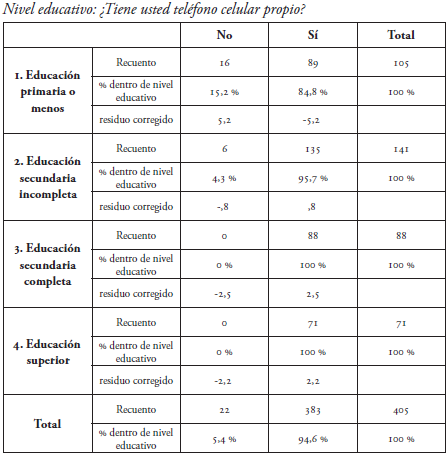 Como se expone en la tabla 3, existe una relación estadísticamente significativa entre las variables nivel educativo y tenencia de teléfono celular (χ2 (3, N = 405) = 29,16, p < 0,10). A mayor nivel educacional, mayor posesión de equipamiento de teléfonos celulares. Considerando que es el aparato que más poseen las personas mayores, este dato, además, se condice con el análisis realizado por Barrantes y Ugarte (2019) que señala que a pesar de que existe una brecha digital con la población general, esta distancia puede ser mitigada según nivel educativo y socioeconómico, considerando que mientras más altas sean estas variables, es más probable que exista un interés y una utilización de recursos TIC.