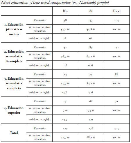 Según lo expuesto en la tabla 4, existe una relación estadísticamente significativa entre las variables nivel educativo y tenencia de computador (χ 2 (3, N = 405) = 58,53, p < 0,10). A mayor nivel educacional, mayor posesión de equipamiento de computador. Tal y como se señaló en el análisis de la tabla 3, mientras más altas sean las variables educación y nivel socioeconómico, es más probable que exista un interés, posesión y utilización de recursos TIC.