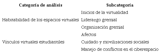 En segundo lugar, fue construido el instrumento para la entrevista virtual y fue diseñado el diario de campo, en el que se añadieron observaciones sobre las redes sociales del Encuentro Nacional de Estudiantes de Trabajo Social. En tercer lugar, fue organizada la información en las categorías de análisis presentadas en la tabla 1.
