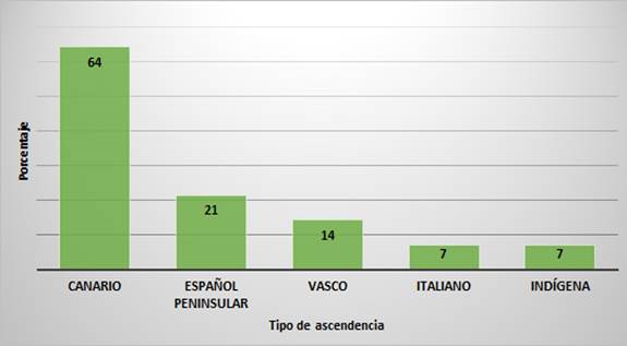 Para el caso del departamento de Canelones, 64% de los entrevistado tiene al menos un ascendente canario, 21% un ascendente español peninsular, 14,2% un ascendente vasco, 7,1% un ascendente italiano y 7,1% un ascendente indígena.