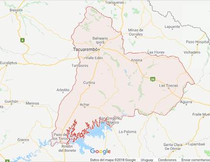 A nivel social, en la actualidad, el medio rural uruguayo presenta múltiples pueblos, centros poblados y parajes con una trayectoria histórica, que se caracterizan por presentar un estancamiento demográfico, y en algunos casos, una marcada tendencia a la desaparición. Las comunidades seleccionadas para este estudio están actualmente sometidas a una situación de profundo envejecimiento de la población, como resultado de la constante emigración de sus jóvenes, acarreando con ello la interrupción en la transmisión de conocimientos botánicos locales. El departamento de Tacuarembó (Fig. 2) está ubicado en el centro-norte del territorio uruguayo, es el mayor en superficie del país (15.438 km2).