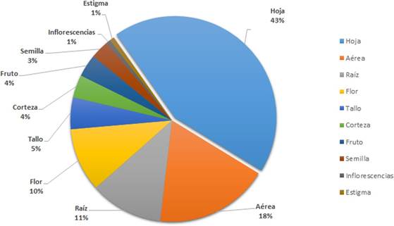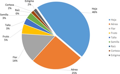 Las partes utilizadas de la PM son variadas: hoja, parte aérea, cáscara del fruto, corteza (denominada entrecáscara por algunos entrevistados), estigma, flor, fruto, inflorescencias, raíz, semilla y tallo. Las Figs. 6 y 7 muestran que la hoja, la parte aérea y la flor son las principales partes de las PM utilizadas en ambos departamentos. Se destaca en Tacuarembó el uso de la raíz como una de las principales partes utilizadas.