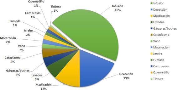 La forma de consumo de las PM también son muy variadas: cataplasma, compresa, decocción, fumada, gárgaras/buches, infusión, jarabe, lavado, maceración, masticación, quemadillo, tintura y vaho.