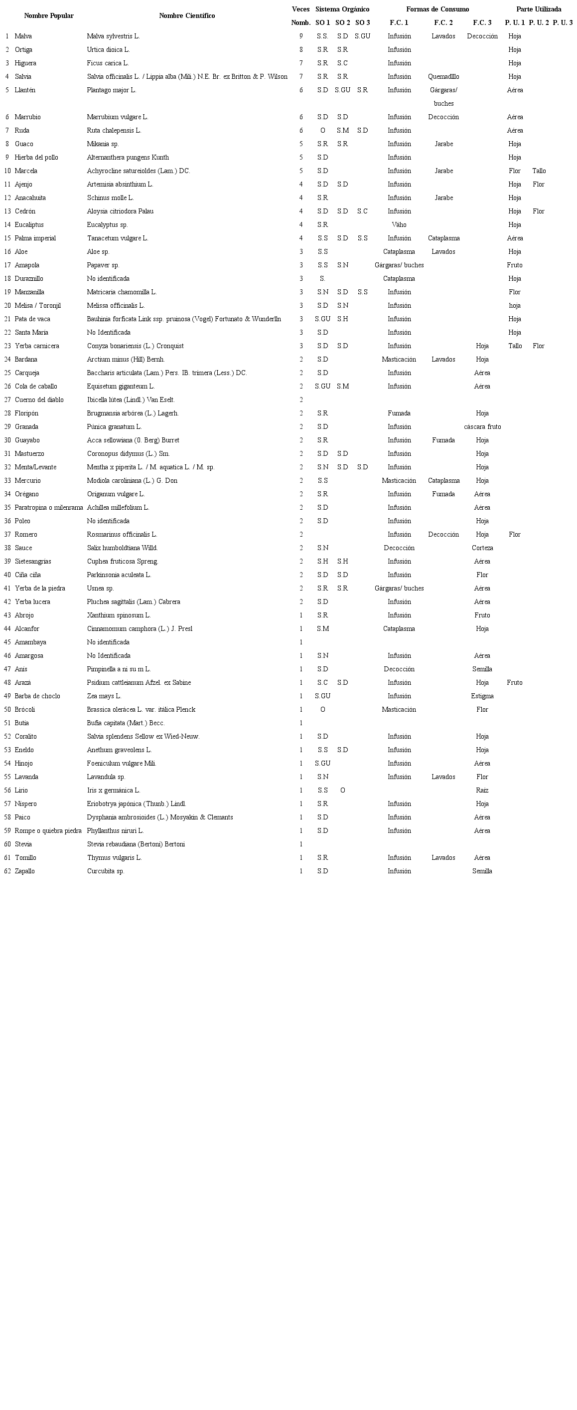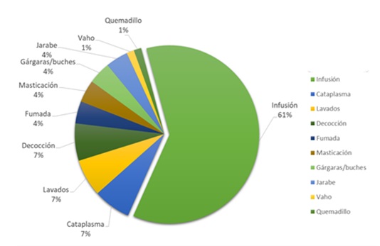 Las plantas medicinales aquí mencionadas tienen incidencia sobre más de un órgano del cuerpo humano, principalmente en los sistemas: digestivo, sensorial y respiratorio, siendo la hoja la parte más utilizada. La infusión es la forma de consumo predominante en las dos zonas de estudio.