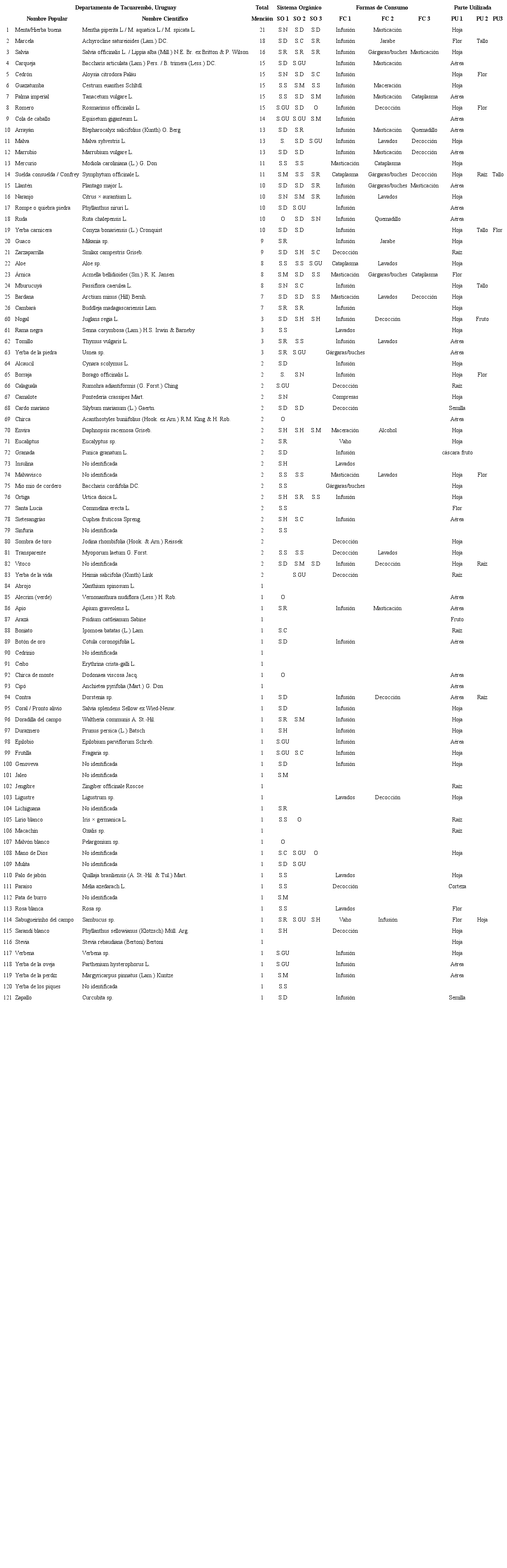 En la Tabla 1 se presentan las 121 especies diferentes de PM registradas en el departamento de Tacuarembó, sus nombres locales e identificación botánica cuando fue posible, usos, formas y partes utilizadas y número de menciones. Tanto en este caso, como en el caso de las PM de Canelones, se consideró una mención por persona, por cada planta mencionada, independientemente de la cantidad de usos que se le atribuyeran. Las plantas medicinales mencionadas con mayor frecuencia (entre 21 y 6 menciones, sobre 34 entrevistados) son: menta/ hierba buena, marcela, salvia, carqueja, cedrón, guazatumba, palma imperial, romero, cola de caballo, arrayán, malva, marrubio, mercurio, suelda consuelda/confrey, llantén, naranjo, rompe o quiebra piedra, ruda, yerba carnicera, guaco, zarzaparrilla, aloe, árnica, mburucuyá, bardana, cambará, congorosa, coronilla, uña de gato y anacahuita.