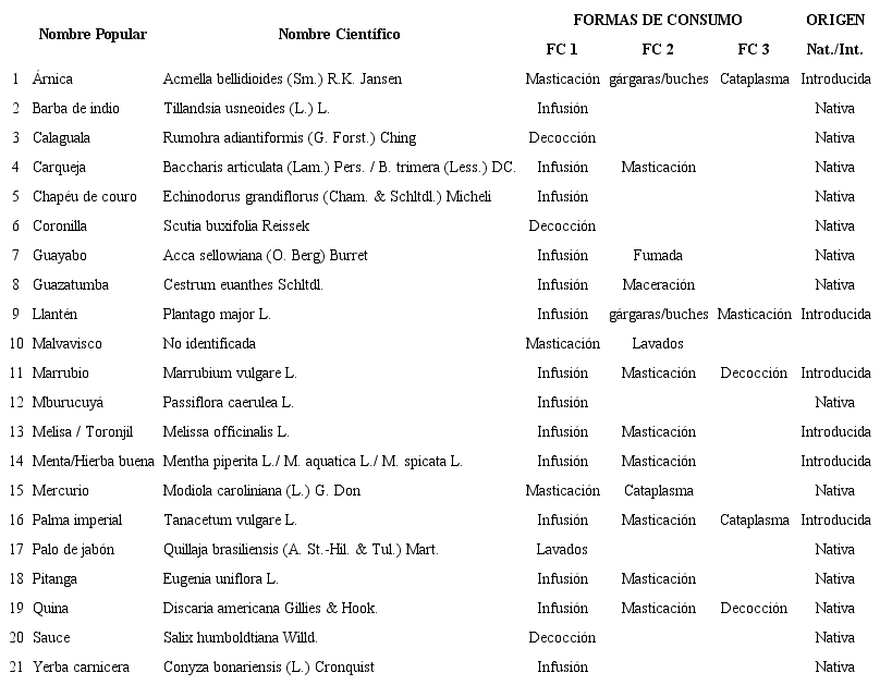 Para este análisis se tuvieron en cuenta, para el departamento de Tacuarembó, solo los descendientes de indígenas. De esta manera, el 27% de los actores con ascendencia indígena hicieron referencia a 21 PM que eran utilizadas por los grupos indígenas que habitaron la región: árnica, barba de indio, calaguala, carqueja, chapéu de couro, coronilla, guayabo, guazatumba, llantén, malvavisco, marrubio, mburucuyá, melisa, menta, mercurio, palma imperial, palo de jabón, pitanga, quina, sauce y yerba carnicera (Tabla 3).