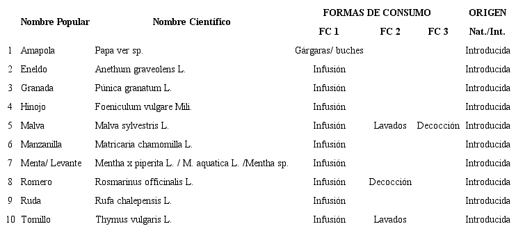 Los descendientes de canarios, 64%, hicieron referencia a diez PM que eran utilizadas tradicionalmente por sus familias de origen: amapola, eneldo, granada, hinojo, malva, manzanilla, menta/levante, romero, ruda y tomillo (Tabla 4).
