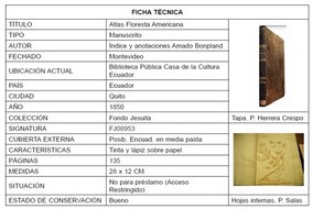 Summary: The manuscript bequeathed by Amado Bonpland, Atlas Floresta Americana 1850, obtained from the Library of the Casa de la Cultura Benjamín Carrión (Quito, Ecuador) after efforts made by various entities, allows us to have material of great historical-scientific value and that contributes to the study of the plants identification described in the Materia Medica Missionera of Pedro de Montenegro. In this sense, it constitutes a documentary collection that integrates valuable data pertaining to the Jesuit period, as well as the period in which Bonpland remained in the River Plate basin. The manuscript was analyzed with an interdisciplinary approach. The objectives of the present study are to present the unpublished document, characterize it historically, transcribe it, translate it into Spanish, update the phytonyms to the current Guaraní, update the identifications of the plants of the Jesuit work Pedro de Montenegro, and compare these identifications with others made on the same work. The characteristics of the manuscript and the historical context of its production are described. The botanical affiliation of the plants identified by Bonpland from the Materia Medica Misionera is presented. The importance of this unpublished document as heritage is highlighted, as well as its possible contributions to Jesuit, botanical and pharmacological studies in general.