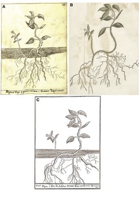 Cabe destacar que las láminas con imágenes que acompañan este manuscrito no son las mismas que acompañan las diversas versiones de la Materia Médica Misionera de P. Montenegro, aunque mantienen muchas similitudes y al parecer fueron copiadas de esta obra, basada a la vez, en parte, en la obra antes mencionada de W. Piso (Fig. 3). Con respecto a la autoría de estas láminas, Díaz Piedrahita (2001: 77) menciona que pudieron haber sido realizadas por algún guaraní.