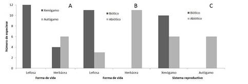 La forma de vida estuvo significativamente relacionada con el sistema reproductivo (Fisher p= 0,0028) y con el síndrome de dispersión de semillas (Fisher/j>= 0,0001): las especies leñosas fueron exclusivamente xenógamas y mostraron síndromes de dispersión mayormente bióticos, mientras que las especies herbáceas fueron tanto xenógamas como autógamas y mostraron síndromes de dispersión exclusivamente abióticos (Fig. 1). La relación entre el sistema reproductivo y el síndrome de dispersión de semillas también fue significativa (Fisher p= 0,0151): las especies xenógamas mostraron síndromes bióticos y abióticos mientras que las autógamas mostraron síndromes exclusivamente abióticos (Fig. 1).