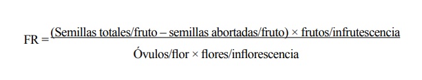 Para estimar la eficiencia en la producción de semillas se cuantificaron el número de semillas, incluidas las abortadas, en 100 frutos de al menos 10 individuos por especie. Se consideraron semillas abortadas, las semillas mal formadas, de tamaños reducidos, aplastadas o carentes de embrión. La relación semilla/óvulo se calculó dividiendo el número promedio de semillas por fruto entre el número promedio de óvulos por flor estimado en una muestra de cien flores de al menos diez individuos por especie. La fracción de semillas abortadas se calculó dividiendo el número de semillas abortadas por fruto entre el número promedio de semillas totales por fruto. La fecundidad relativa (FR), definida como la fracción de semillas sanas producidas por inflorescencia, fue determinada de acuerdo con la expresión propuesta por Ramírez (1992):