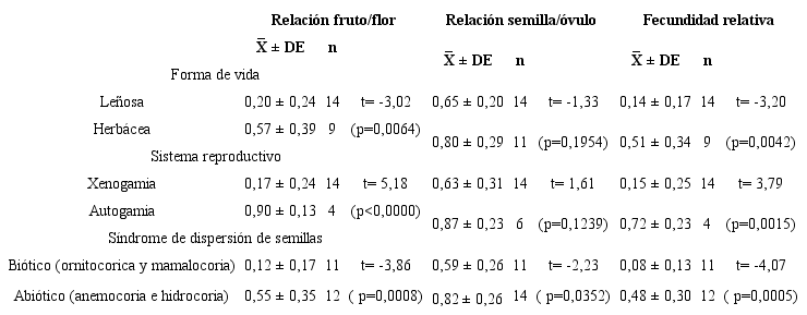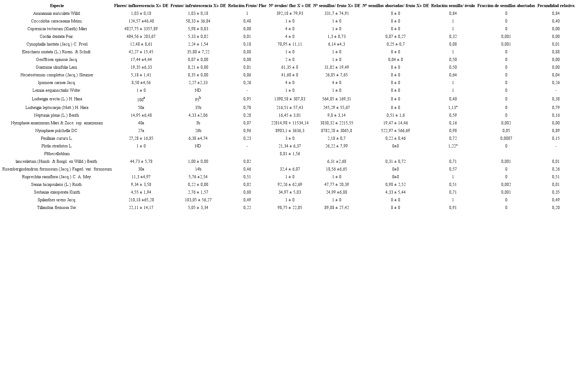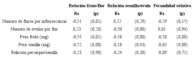 La producción de frutos en las especies estudiadas fue baja en promedio, no obstanteL mostró gran variabilidad (relación fruto/flor X = 0,34 ± 0,35; n= 23 spp.). La producción de semillas, en cambio, fúe alta y menos variable (relación semilla/óvulo X = 0,72 ± 0,28; n= 25 spp.). Con relación a la calidad de las semillas, los frutos mostraron predominio de semillas sanas (fracción de semillas abortadas X= 0,00 ± 0,00; n= 25 spp.). No obstante, la tendencia en la producción de frutos afectó la proporción de semillas sanas producidas por inflorescencia ya que este resultado también fue bajo en promedio y altamente_ variable entre las especies (fecundidad relativa X= 0,29 ± 0,31; n= 23 spp.) (Tabla 1).