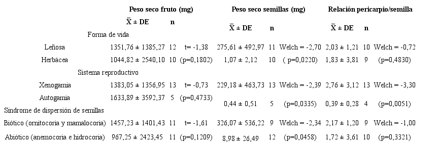 La relación fruto/flor y la fecundidad relativa fueron mayores en las hierbas que en los árboles, en las plantas autógamas que en las xenógamas y en las especies hidrocoras y/o anemocoras que en las zoocoras. La relación semilla/ óvulo fue mayor en las especies hidrocoras y/o anemocoras que en las zoocoras (Tabla 2). Relación entre la eficiencia reproductiva y el número y costo de las estructuras reproductivas La relación fruto/flor estuvo negativamente relacionada con el número de flores porinflorescencia, con el peso del fruto y de la semilla; la relación semilla/óvulo estuvo negativamente relacionada con el número de óvulos por flor y con el peso del fruto; la fecundidad relativa estuvo negativamente relacionada con el peso del fruto y de la semilla (Tabla 3). Variabilidad de la biomasa asignada a frutos y semillas y de la relación pericarpio/semilla entre formas de vida, sistemas reproductivos y síndromes de dispersión de semillas Los valores de peso seco de frutos y semillas estuvieron positivamente relacionados (Rs= 0,63, p= 0,0036). El peso de las semillas fue mayor en las especies leñosas que en las herbáceas, en las xenógamas que en las autógamas, y en las zoocoras que en las hidrocoras y/o anemocoras (Tabla 4). La inversión de biomasa en pericarpio (relación pericarpio/semilla) fue mayor en las especies xenógamas que en las autógamas (Tabla 4).