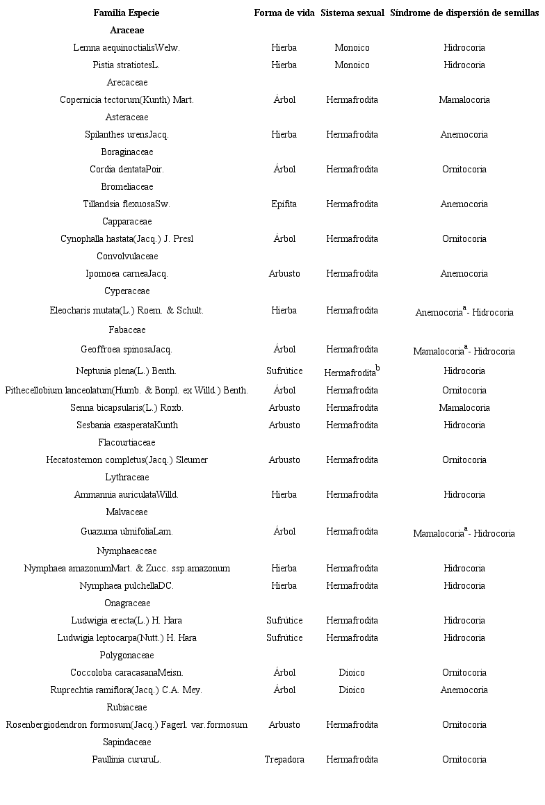Las especies fúeron clasificadas según sus formas de vida como árboles, arbustos, trepadoras, sufrútices, hierbas y epífitas (Anexo 1) manteniendo el criterio de Ramírez (1993). Las clases de sistemas sexuales fueron establecidas de la siguiente manera: hermafroditismo, monoecia y dioecia (Anexo 1). Las especies hermafroditas se reconocieron por la presencia de flores bisexuales en todos los individuos, las especies monoicas por la presencia de flores unisexuales femeninas y masculinas en la misma inflorescencia o individuo, y las dioicas por la presencia de flores femeninas o masculinas por individuo.