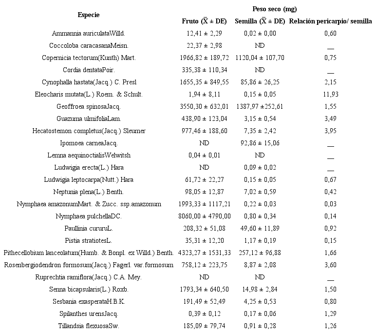 Para cada una de las especies se estimó el peso seco de frutos y semillas así como la relación pericarpio/semilla (P/S) (Anexo 3). El peso fue determinado por separado en 40 frutos y 40 semillas, de al menos diez individuos por especie, previamente secados en una estufa a 60° C. La relación P/S se estimó mediante la fórmula P/ S= (peso promedio del fruto - peso promedio de semillas por fruto) / peso promedio de semillas por fruto. El peso promedio de semillas por fruto fue el producto del número promedio de semillas por fruto por el peso promedio de las semillas individuales. Esta relación (P/S) proporciona una medida relativa del costo de la inversión materna/ progenie (Ramírez et Berry, 1993).