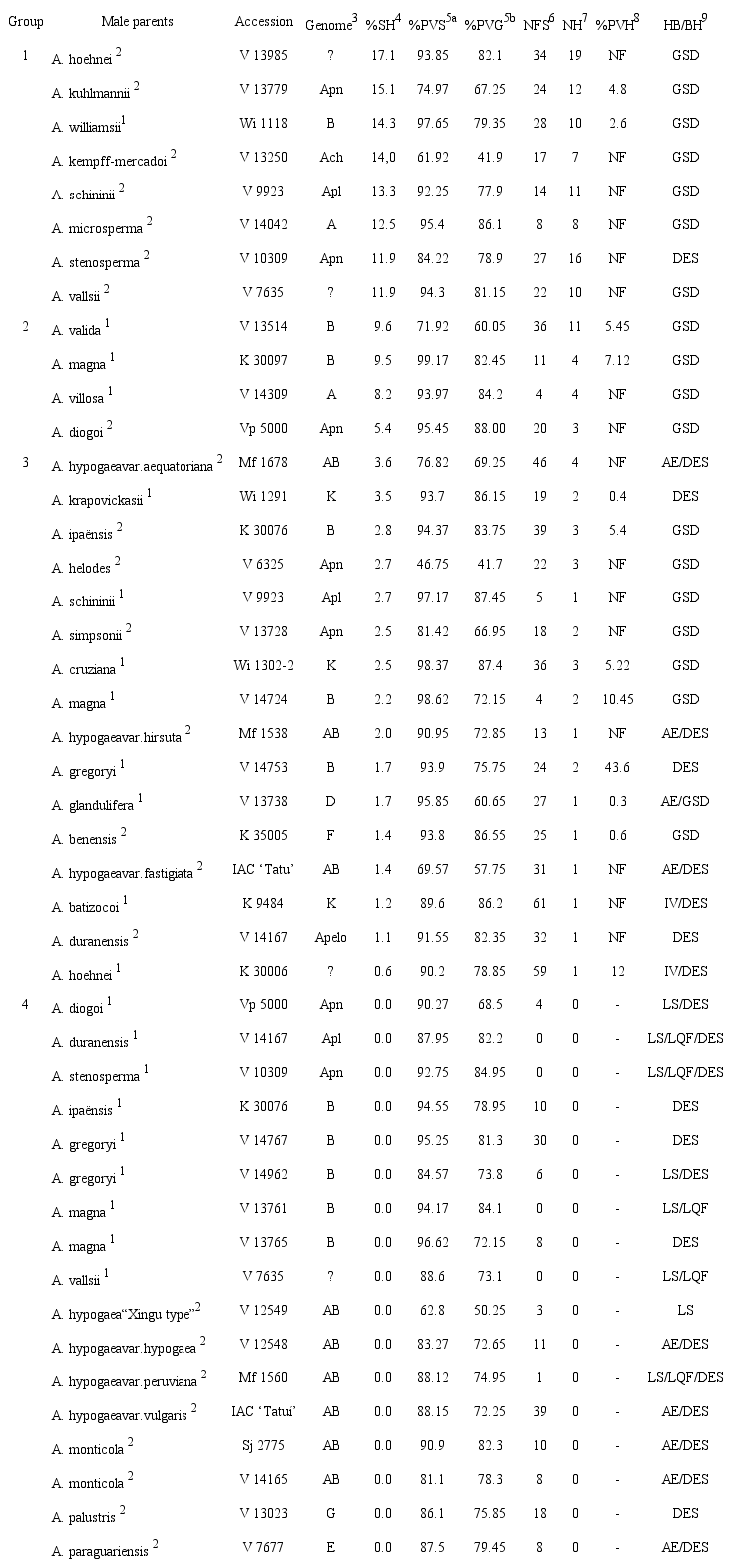 Crossing combinations in this group were the most successful, although they showed differentiated potential. The five hybrid combinations involving B × A genome holders (A. gregoryi×A. kempff-mercadoi,A. kuhlmannii,A. microsperma,A. schininii, orA. stenosperma, the last two with worse results in the first season), all showing low pollen counts, are good candidates for production of colchicine induced highly fertile amphidiploids. Diploid hybrids ofA. gregoryiwith species showing the A chromosome pair are of special interest to peanut breeding, once their chromosome doubling will produce lines with the AABB genome constitution, for direct crossing withA. hypogaea. Furthermore, several of the A genome species of which hybrids where obtained show variable degrees of resistance/tolerance to foliar diseases caused byCercospora arachidicolaHori (early leaf spot),Cercosporidium personatum(Berk. & M.A. Curtis) Deighton (late leaf spot), andPuccinia arachidisSpeg. (rust) (Fávero et al.; 2009, 2015a).