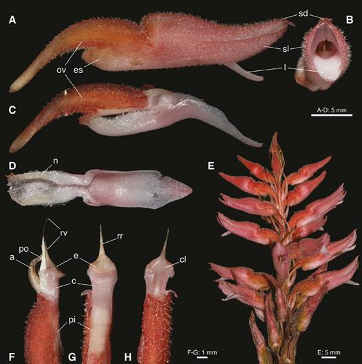En estado vegetativoS. lanceolatase distingue por sus hojas linear-elípticas, pseudopecioladas (de allí el aspecto lanceolado plasmado en el epíteto) y algo carnosas de 20 a 50 cm de long. erectas a semierectas que conforman una roseta basal. Cuando florece las hojas marchitan y desarrolla una espiga subpiramidal a cilíndrica algo densa sobre un escapo erecto de hasta 70 cm (Fig. 1E). Las flores no emiten perfume aparente y son vistosas, de un color rosa pálido a salmón intenso, de hasta 2,5 cm de longitud y posición horizontal (Fig. 1A, E). Los pétalos están adosados al sépalo dorsal que, en conjunto, cubren a la columna. Los sépalos laterales son erectos y acompañan al labelo, también erecto, que abraza con sus márgenes a la columna. Esto se traduce en una flor de conformación tubular y cerrada con la columna oculta (Fig. 1A, B, C). El labelo posee dos nectarios laterales en su base en forma de callosidades y el néctar secretado se acumula en un breve espolón basal formado por la base fusionada de los dos sépalos y el pie extendido de la columna (Fig. 1A, C, D). La coloración rojiza, la ausencia de fragancia y una conformación tubular con acumulación de copioso néctar en su base son características de un síndrome de polinización ornitófilo. En efecto, las flores son polinizadas por colibríes (Singer et Sazima, 2000). Johnson (2001) y Correa et al. (en prensa) describen extensamente esta especie y Guimarães (2014) provee su lista sinonímica completa.