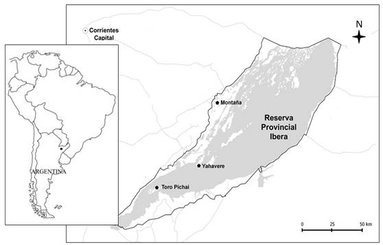 El área de estudio se ubica dentro del sistema de humedales denominado Esteros del Iberá, ubicado geográficamente al centro-norte de la provincia de Corrientes (Argentina). Este se compone de áreas temporal y permanentemente anegadas, que constituyen un paisaje heterogéneo que combina bosques, pastizales, lagunas, bañados y esteros (Neiff, 2004). Las comunidades seleccionadas para este estudio se localizaron en los Parajes “Yahaveré” (28º30’41,73’’S, 57º45’15,98’’W), “Toro Pichaí” (28º42’25,0”S, 58º08’15,7”W) y la Colonia “Montaña” (28º03´13,2’’S, 57º34’42,6’’W) (Fig. 1).