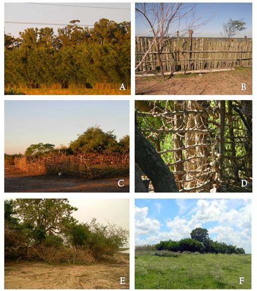 Según el estado y composición de los recursos vegetales presentes en los cercos se los denominó “vivos” o “muertos”, mientras que a su vez se diferenciaron en “simple vivo” cuando el cerco presentaba una sola especie vegetal dominante, “compuesto vivo-muerto” cuando se componía de varias especies vivas y muertas pero sin materiales externos, y “mixto muerto” cuando el cerco exhibía elementos ajenos al ambiente como alambres y clavos en combinación con una especie vegetal que no permanecía viva (Fig. 2).