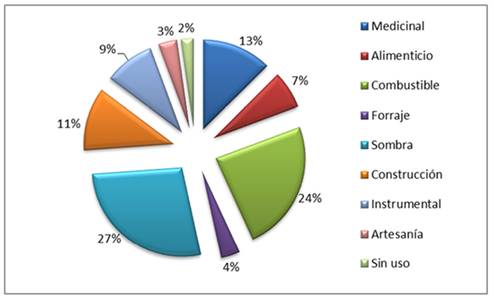 Dentro de las utilidades mencionadas para uso familiar se reconocieron 8 categorías de uso desde un punto de vistaetic. Ellas fueron denominadas como: “medicinal”, “alimenticia”, “combustible”, “forraje”, “sombra”, “construcción”, “instrumental” y “artesanía” (Fig. 3). Las categorías más citadas sobre la base de uso diario fueron las plantas utilizadas como “combustible” y las que brindan “sombra”. Sin embargo, es importante destacar que el resto de las categorías de uso mencionadas para los vegetales presentes en los cercos son de suma importancia para la subsistencia diaria, y como fuente de aprovisionamiento según las pulsaciones del agua presentes en el humedal, comportándose así como reservas de recursos en las épocas de inundaciones (Fig. 4).