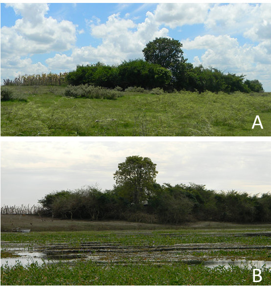 a) Las lomadas arenosas en abanico, con alturas que no superan los 3 m sobre el nivel de las aguas de las lagunas y esteros. Su vegetación está caracterizada por la presencia de formaciones leñosas o “isletas de selva” que, a pesar de ser constantes, son de escasa significancia en relación a la superficie total del paisaje, ocupando las posiciones más elevadas de las pendientes. Tales formaciones descriptas como “bosques higrófilos” o “isletas de selva” registran más de 100 especies vegetales (Arbo et Tressens, 2002) y su estratificación depende directamente de la superficie que ocupa el bosque, asemejándose a la de las selvas ribereñas con 5 o más hectáreas. Mientras que los bosques con superficies menores presentan una estructura más simplificada, con solo dos niveles arbóreos (superior, de 10 a 12 m e inferior, de 4 a 8 m), estratos arbustivo y subarbustivo. Para los casos de isletas aún más reducidas, solo se reconoce un nivel arbóreo de 6 a 8 m altura, rodeado de un cinturón arbustivo y herbáceo (Carnevali, 1994).