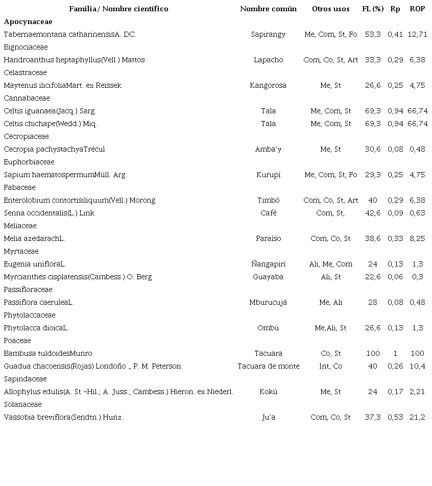 En la Tabla 1 se detallan las 20 especies más importantes según las prioridades de uso en la construcción de los cercos naturales. Se observa, que tantoBambusa tuldoides(Poaceae) comoCeltis iguanaea(Jacq.) Sarg. yCeltis chichape(Wedd.) Miq. (Cannabaceae) son las especies que más se utilizan para la construcción de los cercos naturales de acuerdo a los resultados obtenidos por el FL (fidelity level) y el ROP (rank order priority).