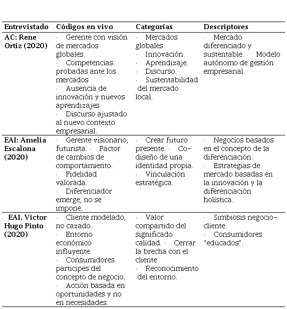 No cabe la menor duda que los elementos expuestos en las diferentes entrevistas generan un nuevo espacio para el constructor de descriptores relacionados a las estrategias del océano azul y que bien pueden ser tomados en consideración en el contexto ecuatoriano. El surgimiento de estos descriptores resultantes se da luego del proceso de categorización desarrollado en el análisis hermenéutico por parte de los investigadores.