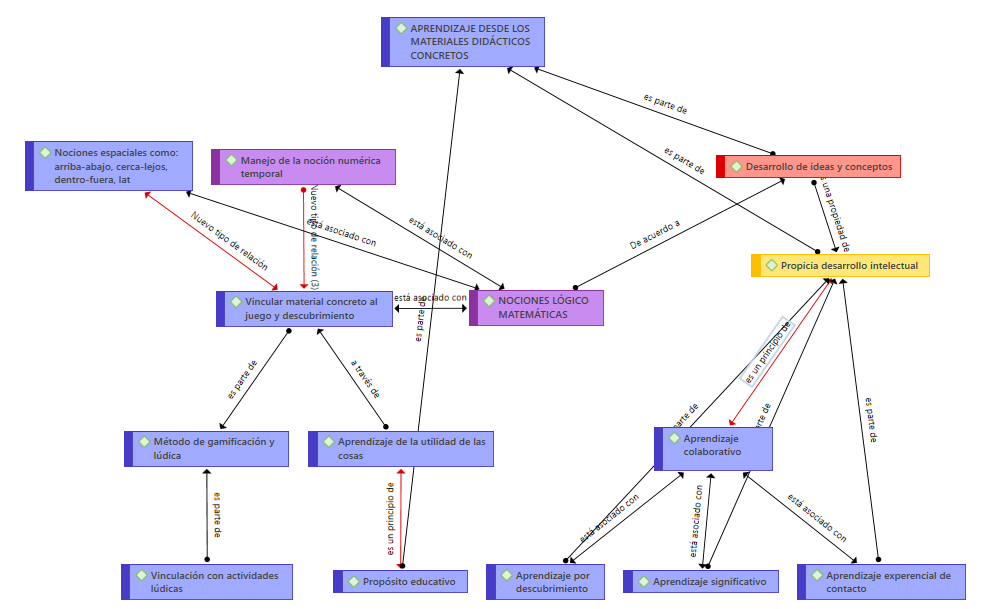 Seguidamente, la categoría axial aprendizaje desde los materiales didácticos concretos, evidencia desde los mundos de los docentes, comprender un proceso de desarrollo intelectual de ideas y conceptos a partir de la interacción con sus pares, en un sentido de socialización de experiencias desde el uso de los materiales concretos y las nociones lógicas matemáticas. El transitar formativo consiste en una relación del uso de la gamificación y el juego como medio que promueve el aprendizaje colaborativo como principio de los aprendizajes por descubrimiento, experiencial y significativo. De modo tal que el aprendizaje se concibe como un todo integrado por procesos de la utilidad de los materiales, en el que se manifiestan nociones espaciales, numéricas, objetos y de cantidad. Una posibilidad de enseñanza desde la autonomía del niño y el seguimiento recreativo, atractivo y motivante del docente (Ver figura 2).