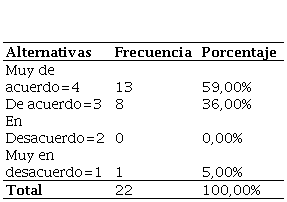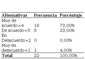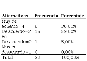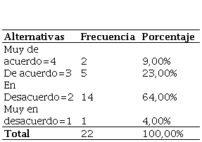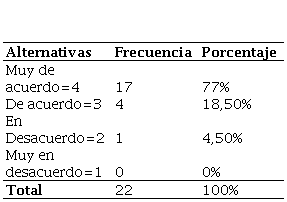 En las siguientes tablas se muestran los resultados de las encuestas realizadas a 22 docentes de la Escuela Fiscal Mixta “Lorenzo Luzuriaga” de la ciudad de Portoviejo.