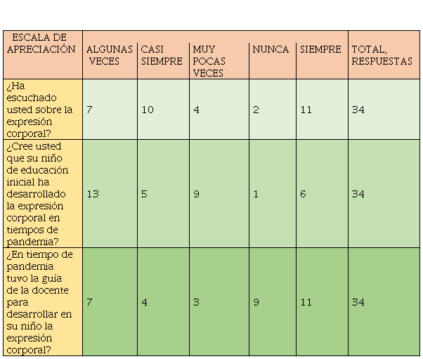 El cuestionario de la encuesta fue aplicada a 34 representantes legales de los estudiantes observados, el mismo que evidenció que en su mayoría han escuchado sobre la expresión corporal y algunas veces sus niños han desarrollado actividades de expresión corporal guiados por ellos.