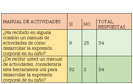 En cuanto al manual de actividades la mayoría no han recibido, pero les gustaría tener uno para poder guiar a sus niños en las distintas actividades de expresión corporal.