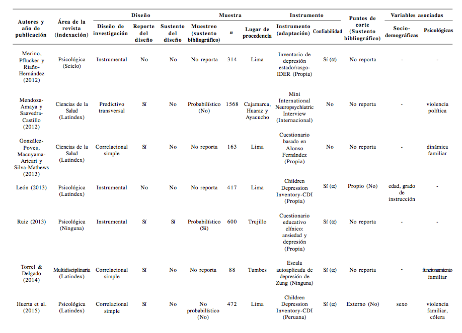 Abstract: Depression in adolescents is a multicausal phenomenon and a predictor of social problems and other disorders. Thus, it is considered a public health problem. This investigation aims to systematically review the characteristics of the scientific articles about depression in Peruvian adolescents published in Peruvian and non- Peruvian journals. The search was performed in the databases of Scielo, Latindex, Redalyc, Scopus, PubMed, and through Google, using a combination of keywords related to the construct, the sample and its origin. The unit of analysis consisted of 21 articles. The reviewed articles showed inconsistency in the reporting and bibliographic support of the research designs, sampling procedures, psychometric properties of the instruments, instruments used to assess the construct which were not evaluated in our context, and cut-off points obtained in other countries’ samples. Therefore, we can state that the reviewed articles do not fully comply with the publication standards proposed by the American Psychological Association.