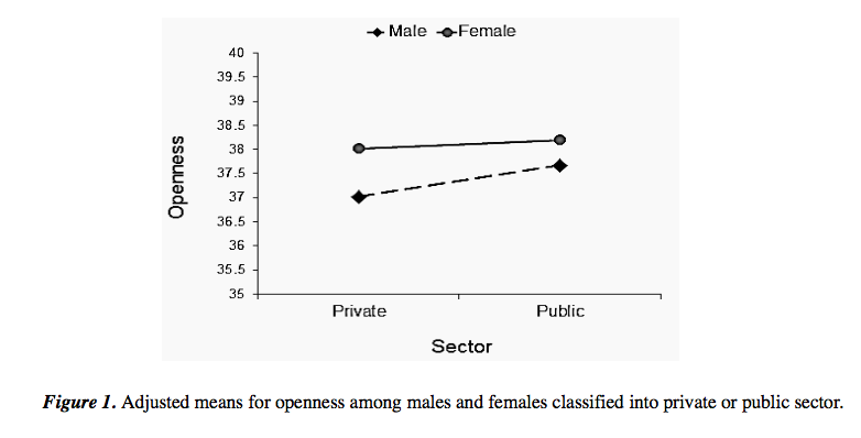 No obvious interpretation of these results is available. The concept of person-organization fit suggests that people attracted to the public sector, especially men, are more likely to see beauty in things that others might not notice, frequently daydream, appreciate art, and need a creative outlet (De Young, 2014). However, theoretically, it is equally likely that years in the public sector cause frustration in the achievement of task goals and enhance these dispositions as escape routes. The nature of the sample grants greater credibility to the former interpretation. The sample was strongly biased toward the private sector. Even the participants who reported having one or more years working in the public sector had, on average, more years in the private sector. The emergence of differences in personality that are attributable to a very limited number of years in the public sector suggests that the employees arrived in the public sector already with greater Openness. This interpretation is consistent with the absence of a significant interaction of age with time in the public sector. Working in the public sector appears to grant lower social status than working in the private sector in Peru; perhaps an open mind is needed to transcend this perception, at least in the population targeted in this study. The significant interactive effects of gender and time in the public sector on Openness could be reflecting a greater Openness needed by men to enter an institution of lower social status. However, only longitudinal research will be able to produce evidence relevant to the direction of causality.