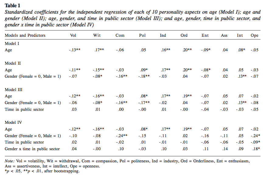 This study addresses the hypothesis that time spent working in the public sector predicts personality traits. Saks and Ashforth (1997) suggested that having a high person-environment fits will lead to a more positive work experience and less negative affect, and consequently individuals will be more likely to remain in that environment. There is considerable empirical evidence that person-job and person-organization fit are associated with such organizational outcomes as job satisfaction, intention to quit, work-related stress, prosocial behaviors such as organizational citizenship behaviors and teamwork, and ethical behavior and work performance (Erdogan & Bauer, 2005; Kristof, 1996; Lyons, Brenner, & Fassinger, 2005; Lyons & O’Brien, 2006; Roberts & Robins, 2004; Saks & Ashforth, 1997; Sekiguchi, 2004). Therefore, employees who are attracted to the public sector and remain in it can be expected to be those whose personality, to some extent, fit the sector. However, the personality of public sector employees, if there is one, has not been described. Psychological studies of public sector employees have addressed, for example, relationships between Big Five personality traits and job engagement (e.g., N. Zaidi, Wajid, F. Zaidi, G. Zaidi, & M. Zaidi, 2013), job performance (Cooper, Knotts, McCord, & Johnson, 2013), and counterproductive work behaviors (Raman, Sambasivan, & Kumar, 2016), but the extent to which permanence in the public sector is associated with specific personality traits has not been addressed.