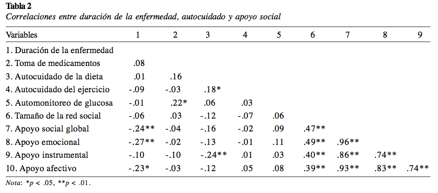 Todas las dimensiones del apoyo social percibido tuvieron correlación significativa entre sí. En las dimensiones del autocuidado, el ejercicio se correlacionó con la dieta, mientras que el automonitoreo de glucosa lo hizo con la toma de medicamentos. También se encontró una correlación inversa entre autocuidado de la dieta y apoyo instrumental; asimismo, entre duración de la enfermedad y apoyo social global, apoyo emocional y apoyo afectivo (ver Tabla 2).