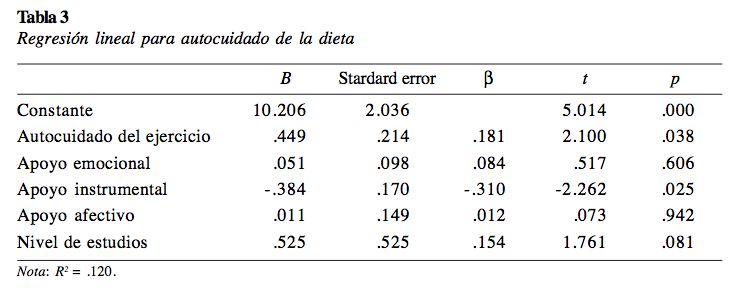Considerando que el autocuidado de la dieta se asoció de forma significativa con las dimensiones de apoyo social, se desarrolló un modelo de regresión lineal al que, además, se agregó la variable del nivel de estudios. El puntaje de la prueba de Durbin-Watson indica que hay independencia de errores (1.713) y el factor de inflación de la varianza indica que se cumple con el supuesto de no multicolinealidad (valores entre 1.042 y 3.782). El porcentaje de la varianza explicada fue del 12%. Se encontró que el apoyo instrumental y el autocuidado del ejercicio se asocian significativamente con el autocuidado de la dieta (ver Tabla 3).