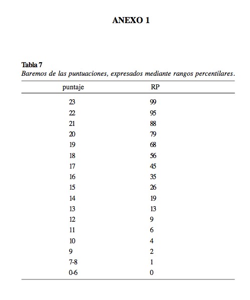 Finalmente, los baremos han sido trabajados mediante el rango percentilar (RP) que es definido por Frisbie (2005) como el porcentaje de puntuaciones menores a un valor determinado, para su cálculo se aplicó el algoritmo desarrollado por el programa Spss v24 (IBM, 2016).