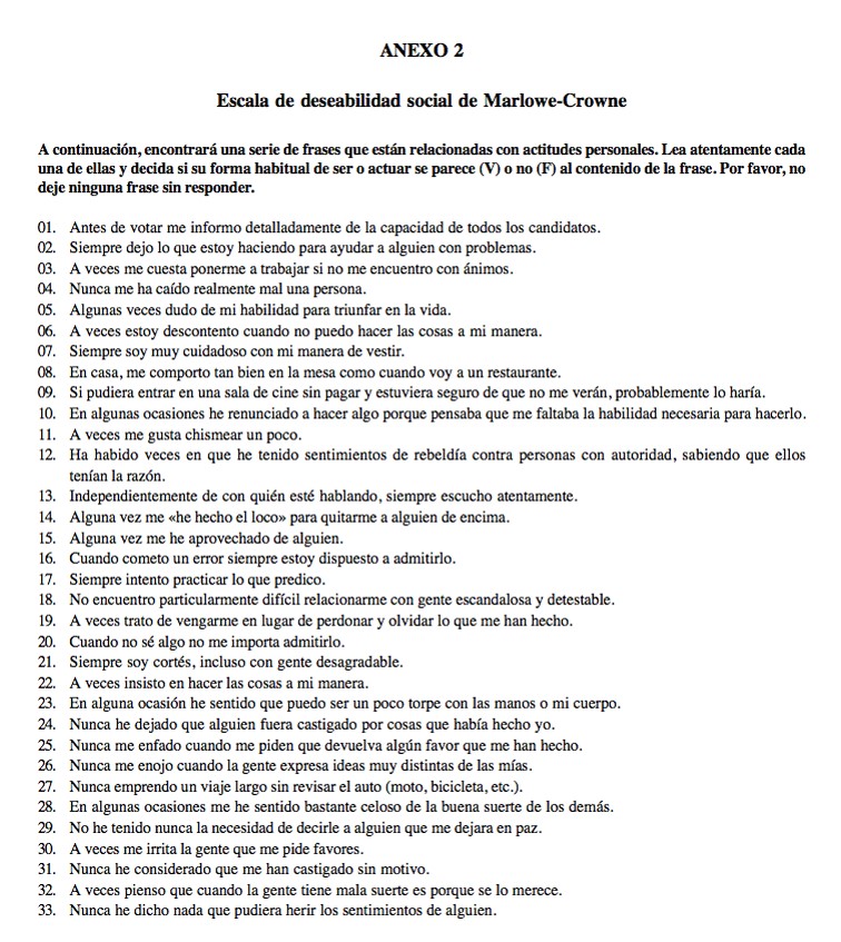 La Escala de deseabilidad social (MCSDS) fue construida por Marlowe y Crowne en 1960 y tenía por finalidad medir la tendencia a dar una imagen favorable de sí mismo, ante diversas situaciones propuestas. La escala está conformada por 33 ítems, los cuales presentan enunciados acerca de diferentes situaciones cotidianas, ante las cuales se debe responder usando un formato de tipo dicotómico (verdadero-falso). Se presentan 17 ítems de forma directa y 16 de forma inversa, los cuales se deben recodificar, de manera que se expresa la presencia de la DS. Las puntuaciones totales que se pueden obtener fluctúan entre cero (baja DS) y 33 (alta DS). Las puntuaciones derivadas de aplicar este instrumento en distintas poblaciones han mostrado elevadas estimaciones de confiabilidad, aplicando coeficientes de estabilidad, así como de consistencia interna (Crowne & Marlowe, 1960); y ha presentado diferentes evidencias de validez (Leite & Beretvas, 2005; Loo & Loewen, 2004; Loo & Thorpe, 2000).