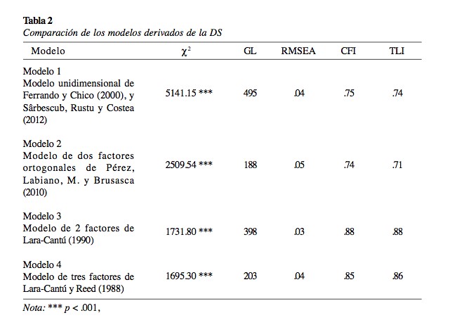 Inicialmente con la primera muestra se trató de establecer a partir de las estructuras factoriales encontradas en diferentes estudios previos cual se replicaba mejor en la muestra de docentes para ellos se aplicaron análisis factoriales confirmatorios, por ello se establecieron como modelos a contrastar el modelo 1 de Ferrando y Chico (2000) y de Sârbescub et al. (2012), quienes indicaban que existía una estructura latente unidimensional. A continuación, se incluyó el modelo 2 de Pérez et al. (2010) con dos factores ortogonales. Luego el modelo 3 de Lara-Cantú(1990) con factores oblicuos y finalmente el modelo 4 de Lara-Cantú y Reed (1988) con tres factores oblicuos.