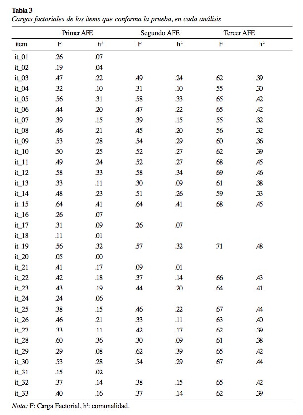 Se desarrollaron tres análisis factoriales exploratorios, sucesivos, de manera que de los 33 ítems originales que conforman la prueba, sólo 24 de ellos sustentaban una solución unidimensional, lo cual fue verificado de acuerdo con los análisis estadísticos preliminares como el test de esfericidad de Bartlett y la prueba de Kaiser, Meyer y Olkin (Hair et al., 2014) y el método de Hull para establecer la significación estadística de los factores a retener (Lorenzo-Seva et al., 2011). Este hallazgo concuerda con los resultados reportados en los estudios de Ferrando y Chico (2000) en estudiantes argentinos, y Sârbescub et al. (2012) en estudiantes de rumanos, lo cual sirve de sustento para interpretar el constructo desde una visión unitaria, estableciendo uno de los requerimientos más importantes de un instrumento de medición como es el de medir un único rasgo o atributo latente (Wilson, 2005).