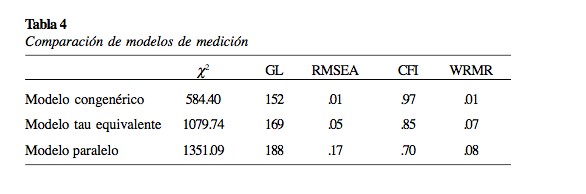 A fin de establecer la pertinencia de aplicar el coeficiente Alfa de Cronbach como estimación de la confiabilidad, se procedió a evaluar el modelo de medición que sustentaban las puntuaciones derivas, pues este coeficiente tiene como requisito el ser un mejor estimador en el caso de corresponder al modelo de medición de ítems tau-equivalentes (TrizanoHermosilla & Alvarado, 2016; Cho & Kim, 2014; Dunn et al., 2014; Zhang & Yuan, 2016). El modelo, asume que, todos los ítems de la prueba tienen la misma puntuación verdadera, o cargas de factores iguales en todos los elementos en un modelo factorial, éste es un requisito para aplicar el coeficiente alfa (Cronbach, 1951). Si se viola este supuesto, el valor de la verdadera confiabilidad será subestimado (Raykov, 1997; Graham, 2006) en una cantidad que puede variar entre 0.6 y 11.1% según la gravedad de la violación (Green & Yang, 2009). Como indican Teo y Fan (2013) por lo general los datos no cumplen con esta suposición generalmente. Por otro lado, el modelo paralelo es más restrictivo para medir la consistencia interna, pues asume que todos los ítems presentan iguales, medias, varianzas y varianzas de error. El modelo congénerico es el menos restrictivo de los modelos de medición de manera que en los ítems, las varianzas y las varianzas de error pueden ser diferentes, por ello es adecuado para un constructo unidimensional, en la medida que no utiliza suposiciones poco realistas sobre los ítems (Jöreskog & Sörbom, 1979). Por ello se recomienda aplicar el coeficiente ω de McDonald (Dunn et al., 2014).