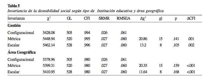 El segundo objetivo fue realizar la comparación de los resultados de la DSen los docentes de segundo grado de primaria, según variables demográficas, de manera que los análisis de la invarianza de la estructura factorial unidimensional, permiten concluir que las puntuaciones fueron invariantes. La comparación poblacional de la DS indicó que no existen diferencias estadísticamente significativas según el tipo de gestión, el área geográfica y la interacción de ambas variables. Es decir, este fenómeno se presenta de forman similar, en independencia del contexto sociodemográfico analizado. Dada la ausencia de estudios que analicen las diferencias de deseabilidad social según estas variables, este resultado no ha podido ser comparado con otras investigaciones antecedentes.