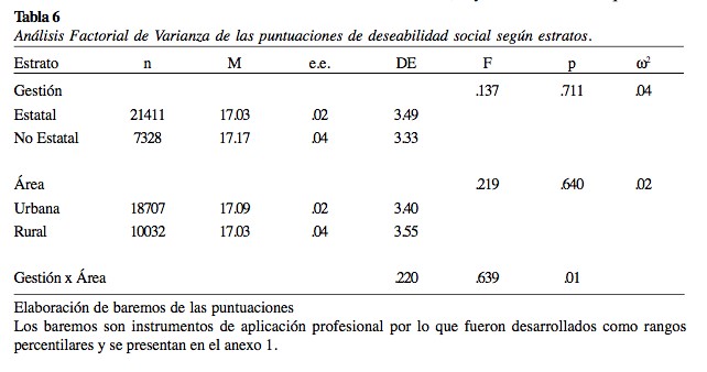 Finalmente debe señalarse que los resultados del estudio han demostrado la importancia de medir la deseabilidad social, es decir la tendencia de autoatribuirse características de personalidad socialmente deseables y rechazar aquellas indeseables, al realizar investigaciones psicológicas, en la medida que en el contexto educativo se encuentra presente en los procesos de interacción social, por lo que resulta necesario tomarlo en cuenta especialmente cuando se realizan evaluaciones de los factores propios de los estudiantes y de los docentes con la finalidad de obtener resultados más precisos en el contexto de los modelos multinivel de factores asociados.