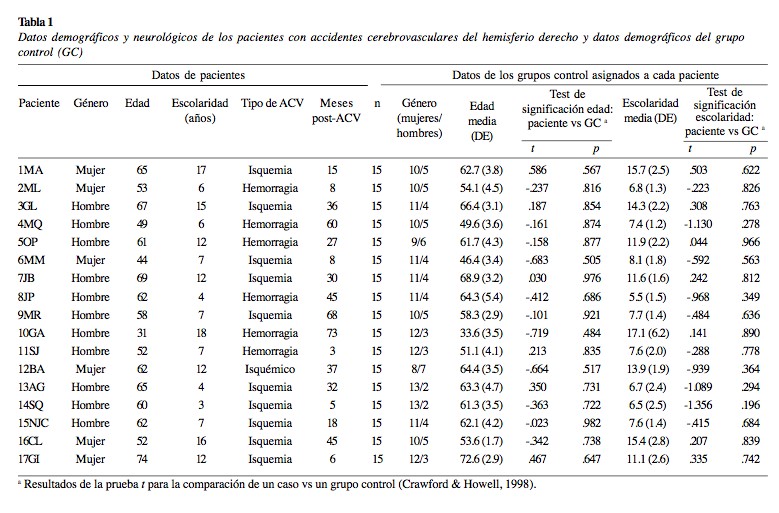 La inclusión del grupo de pacientes se realizó en el marco de un proyecto de investigación UBACyT desarrollado durante los años 2011-2014, de la Facultad de Psicología de la Universidad de Buenos Aires, que tuvo como objetivo evaluar las alteraciones de la comunicación verbal en pacientes con lesiones del HD. Para la presente investigación, se evaluaron 17 pacientes con lesiones únicas del HD debidas a accidentes cerebrovasculares (ACV), 6 mujeres y 11 hombres, con una edad media en años de 58 (10.4) y una escolaridad media en años de 9.7 (4.9). En la Tabla 1 se muestran los datos demográficos y neurológicos de cada paciente. Todos fueron reclutados y evaluados en la Unidad de Neuropsicología del Hospital Interzonal General de Agudos «Eva Perón» de San Martín, provincia de Buenos Aires, Argentina. Los pacientes fueron derivados por los médicos neurólogos a cargo de su tratamiento clínico, quienes les propusieron participar en esta investigación. Los criterios de inclusión/ exclusión fueron: 1) ACV isquémico o hemorrágico que afecte únicamente el HD con al menos tres meses de evolución, documentado por estudios de tomografía axial computarizada (TAC) o resonancia magnética nuclear (RMN); 2) que se encuentren con seguimiento ambulatorio al momento de la evaluación; 3) ausencia de alteraciones sensoriomotoras graves o heminegligencia; 4) sin otros antecedentes neurológicos y/o psiquiátricos adicionales; 5) sin patologías clínicas adicionales que puedan afectar la cognición (e.g., hipotiroidismo); 6) ausencia de alteraciones motoras y/o sensitivas que afecten la mano dominante; 7) ausencia de antecedentes de alteraciones de adquisición del lenguaje, lectura o escritura; 8) lengua nativa español. El cumplimiento de los criterios de inclusión/exclusión fue realizado por dos médicos neurólogos especialistas en neuropsicología o neuropsiquiatría, quienes evaluaron cada caso teniendo en cuenta la información de la historia clínica de los pacientes, datos recabados de una entrevista semi-estructurada y análisis de las imágenes cerebrales estructurales (TAC y/o RMN).