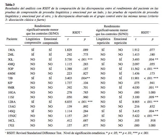 En la Tabla 3 se muestran, además, los resultados de la prueba RSDT. La misma fue utilizada para analizar si hubo diferencias significativas entre la discrepancia observada entre las tareas de comprensión en el paciente y la discrepancia observada en el grupo control entre las mismas tareas (criterio 3 para disociación clásica o fuerte). Los resultados del RSDT para las pruebas de comprensión prosódica mostraron que sólo el paciente 3 cumplió el tercer criterio para disociación clásica. Por su parte, los pacientes 7 y 12 lo hicieron para disociación fuerte. En los pacientes 1, 2, 5 y 14 no se observó disociaciones entre la comprensión de prosodia lingüística y emocional, ya que la discrepancia entre las pruebas de los mismos no tuvo diferencias estadísticamente significativas respecto de la discrepancia observada en el grupo control (criterio 3).