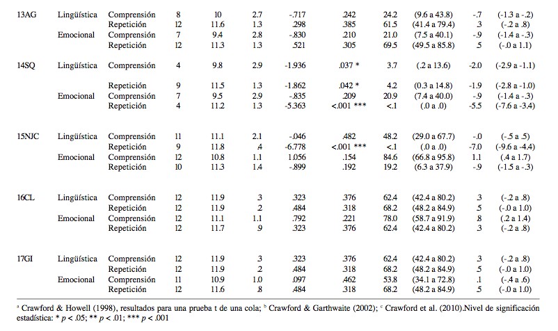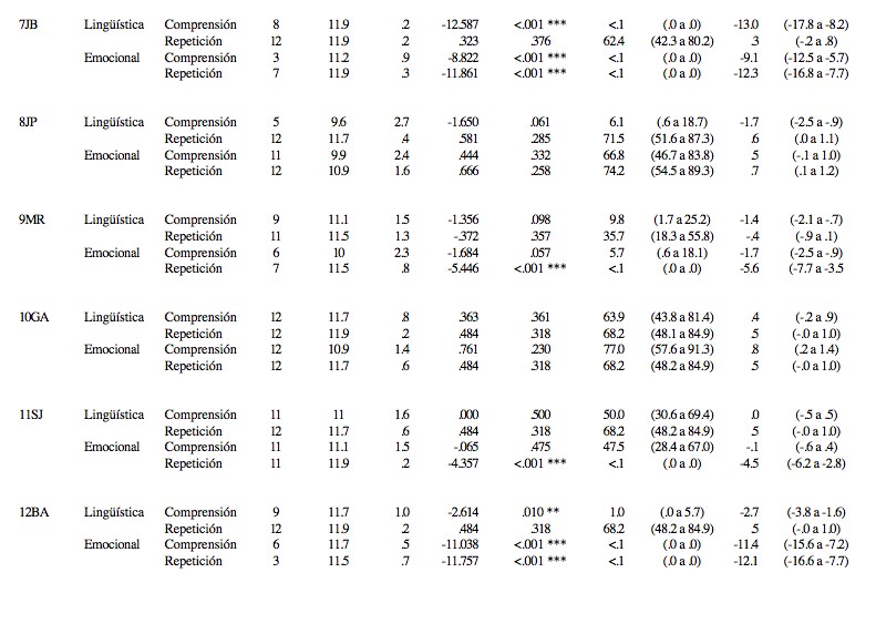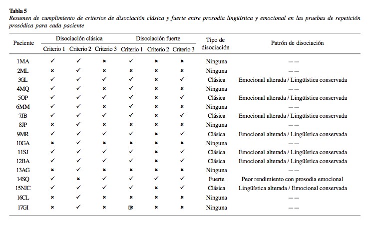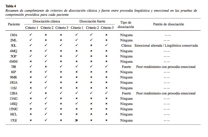 Como se muestra en la Tabla 2, los pacientes 4, 6, 8, 9, 10, 11, 13, 15, 16 y 17 tuvieron rendimiento sin diferencias significativas con los controles en ambas pruebas de comprensión prosódica (lingüística y emocional), por lo que en ellos no se cumple con el criterio 1 para ningún tipo de disociación (clásica o fuerte).