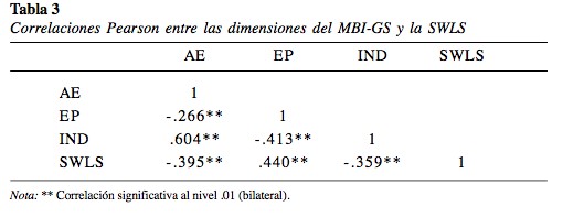 Sobre la evidencia de validez en relación con otros constructos, se encontró un grado de influencia del burnout sobre la SV, aportando a su explicación las dimensiones de EP y AE en contraste con la dimensión de IND, la cual presentó una escasa influencia. Este resultado es apoyado por otros reportes empíricos (Durán et al., 2005; Hakanen & Schaufeli, 2012; Hayes & Weathington, 2007) y es acorde a la propuesta explicativa vertida en el marco de la Psicología de la Salud Ocupacional que explica las implicancias de estrés y sus derivados (burnout y engagement) en el bienestar de los trabajadores (Bakker & Demerouti, 2013; O´Driscoll & Brough, 2010).