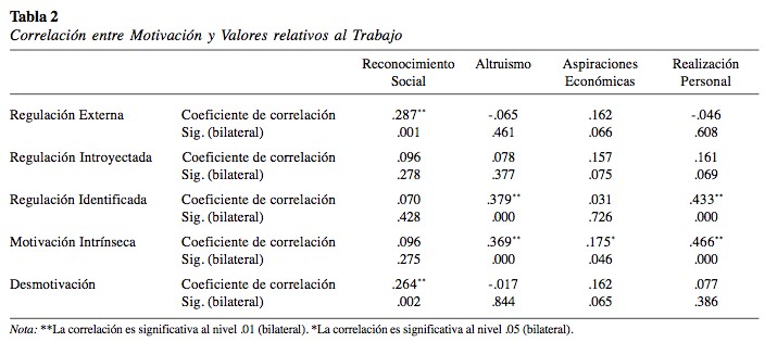 Analizando la correlación entre las variables de Motivación y Valores dirigidos hacia el Trabajo, se encontraron asociaciones significativas entre sus dimensiones. La Regulación Externa se asoció de forma positiva con el valor Reconocimiento Social, expresando cómo un comportamiento es ejecutado por el motivo de obtener una recompensa externa de tipo social, como puede ser el caso de la búsqueda del reconocimiento por parte de la sociedad o bien la búsqueda de prestigio profesional.